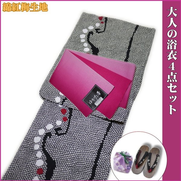 浴衣 レディース 4点 セット 小粋 高級綿紅梅織浴衣(黒地にドット柄)