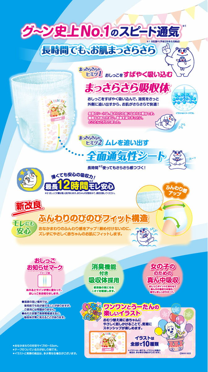 goo.n おむつ グーン パンツ まっさらさら通気 Lサイズ 56枚女の子 goon オムツ【商品の特徴】 ●「まっさらさら吸収体」は、おしっこをすばやく吸い込む! おしっこがおむつ表面に残らないからすぐにお肌がさらさらで快適! ●お腹周りのふんわり感をアップ!赤ちゃんのお肌にやさしくフィット。