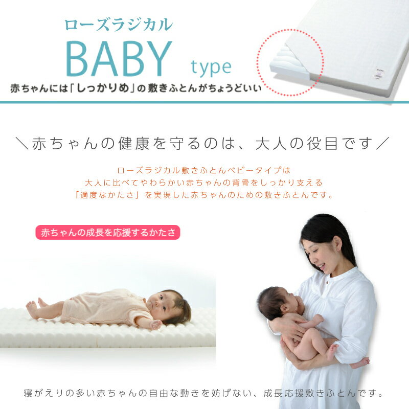 敷き布団には、赤ちゃんのカラダをしっかり支えるローズラジカル敷き布団ベビータイプを使用しています。